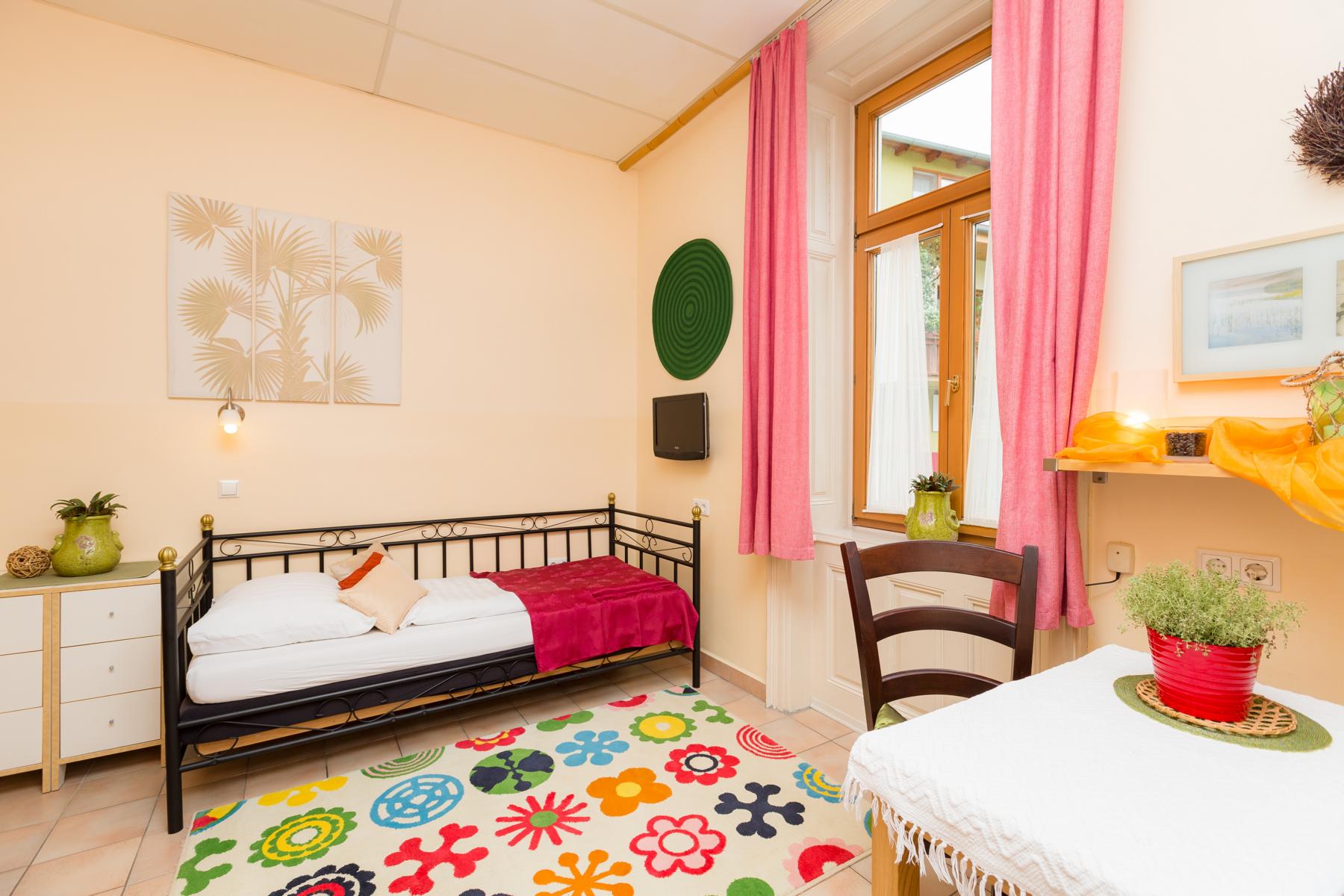 Standardbelegung sind 2 Personen, 1 Doppelbett oder 2 Einzelbetten, auf Nachfrage bekommen Sie 1 Kinderbett. Gartenzugang! Ausstattung: Kochnische mit Geschirr, Kaffeemaschine, Kühlschrank, etc.